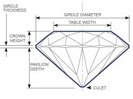 Girdle: The narrow rim that separates the crown from the pavilion. It measures the widest part of the diamond
